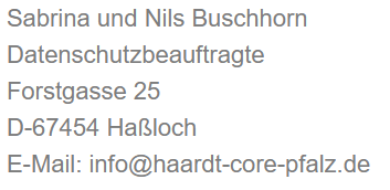 Die Haardt Core Pfalz GbR (im Folgenden Haardt Core Pfalz) nimmt als Anbieterin der Web-Seiten www.HaardtCorePfalz.de, www.haardt-core-pfalz.de, www.haardtcore-pfalz.de, www.haardtcore.de sowie www.haardt-core.de und verantwortliche Stelle die Verpflichtung zum Datenschutz sehr ernst und gestaltet seine Web-Site so, dass nur so wenige personenbezogene Daten wie nötig erhoben, verarbeitet und genutzt werden. Unter keinen Umständen werden personenbezogene Daten zu Werbezwecken an Dritte vermietet oder verkauft. Ohne die ausdrückliche Einwilligung des Besuchers werden keine personenbezogenen Daten für Werbe- oder Marketingzwecke genutzt.